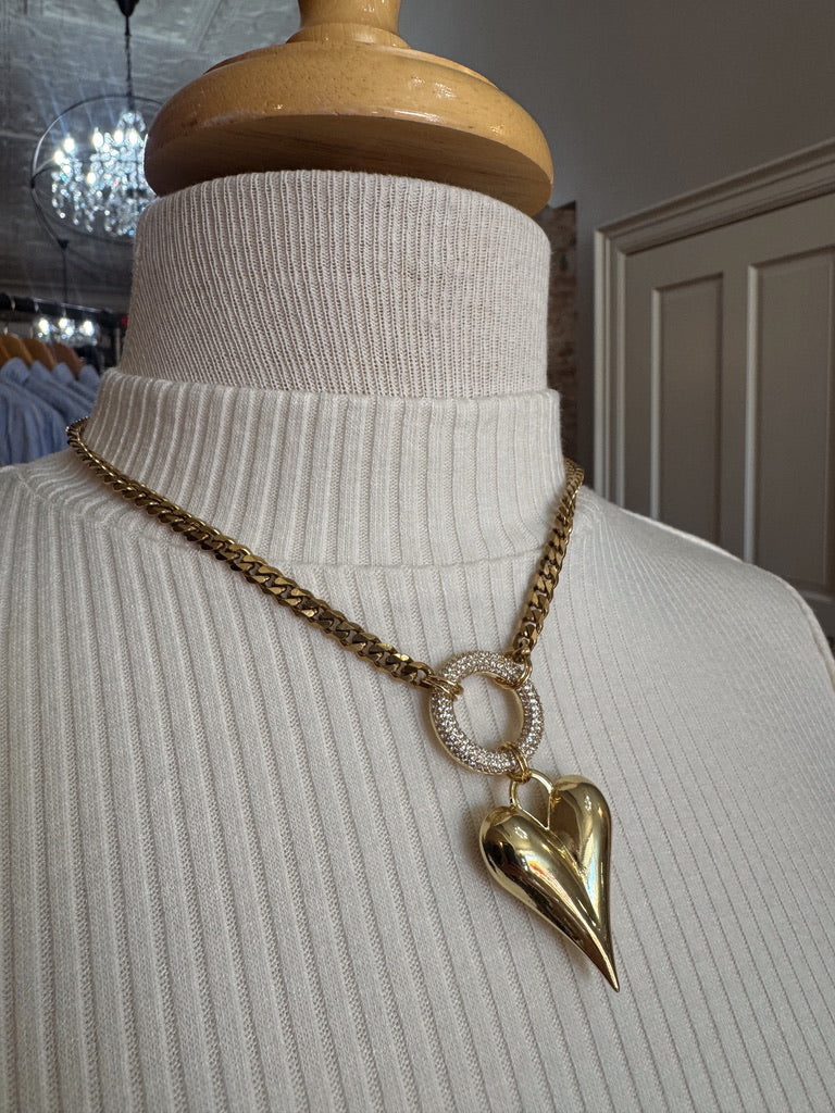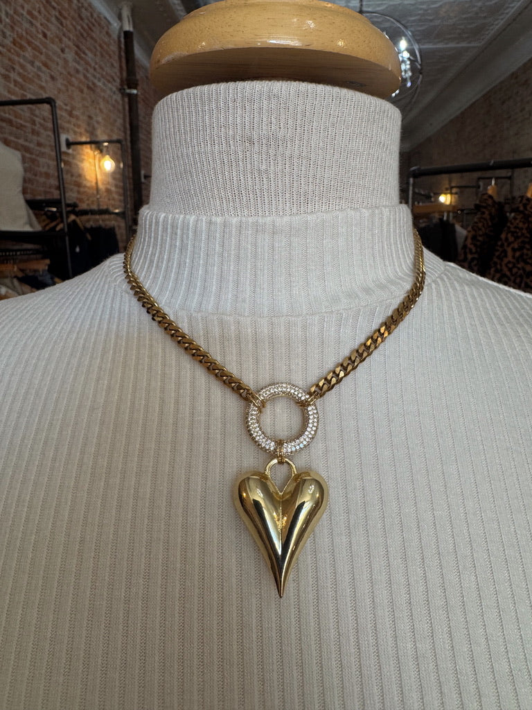 This elegant gold necklace features a bold, thick chain complemented by a dazzling bejeweled circle charm with a striking heart detail. Designed to stand out, it adds a confident touch of sophistication to any outfit. Perfect for making a meaningful statement with timeless style.