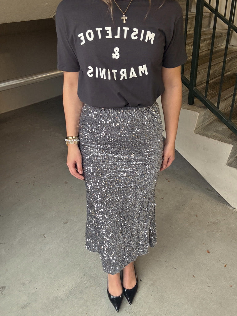 Elevate your holiday wardrobe with this stunning sequin midi skirt. Crafted with soft, shimmering sequins that catch the light beautifully, it's the perfect piece for festive celebrations and special occasions.