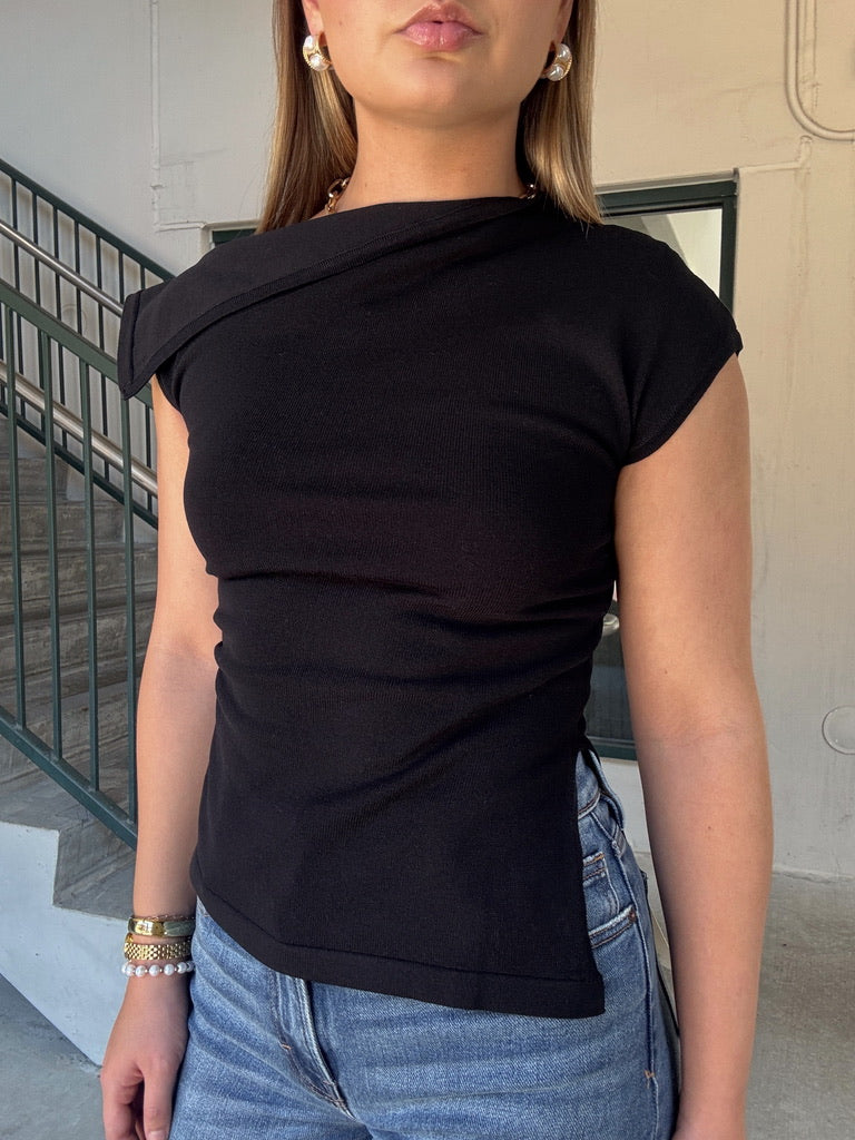 This black top features a distinctive overlap detail at the neck, adding a playful yet polished edge to your wardrobe. Crafted for comfort and style, it easily elevates casual or dressy looks with its unique neckline. Perfect for confident, modern wearers seeking a versatile piece that stands out.