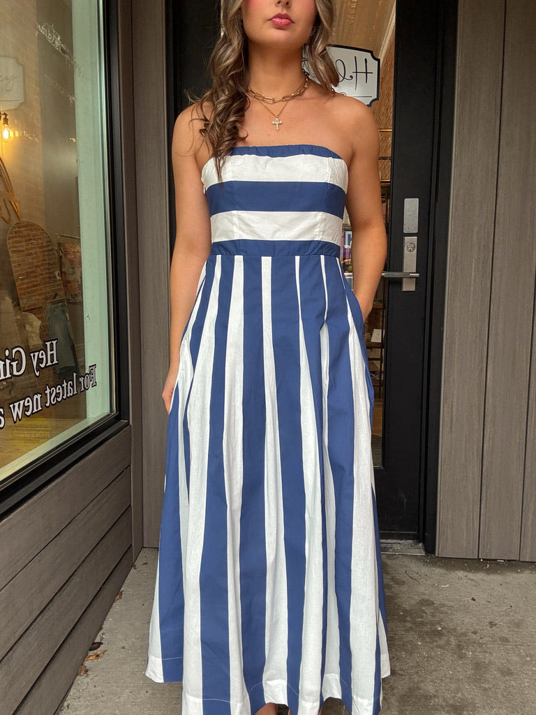 Vertical Blue and White Striped Midi Dress